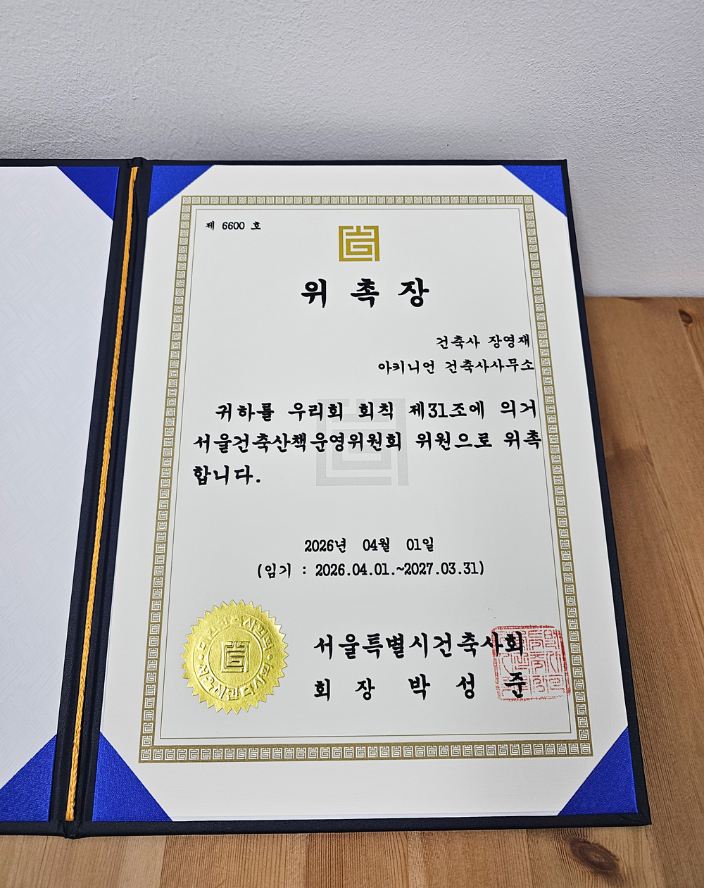 서울특별시건축사회 [2026 서울건축산책] 운영위원회 위원으로 위촉되었습니다.